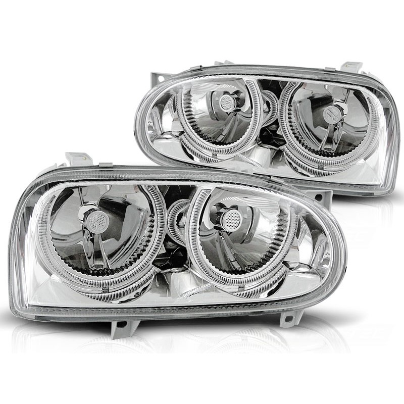 Découvrez les Phares Angel Eyes Chrome spécialement conçus pour la VW Golf 3, modèles de septembre 1991 à août 1997. Ces phares avant innovants, dotés de doubles cercles halo, apportent une touche de modernité et de sophistication à votre véhicule tout en garantissant une visibilité optimale sur la route.