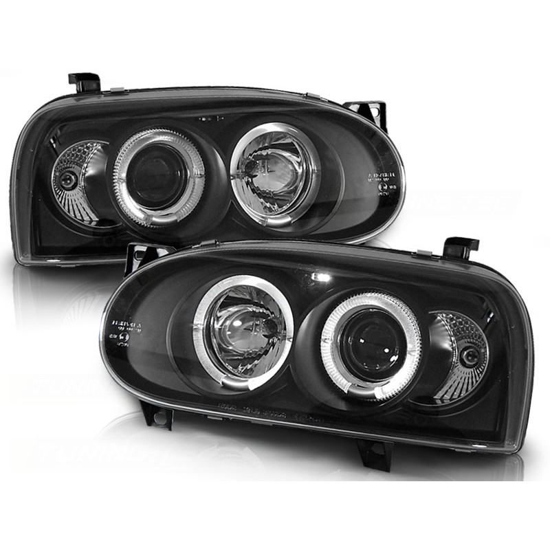 Découvrez les phares Angel Eyes noirs spécialement conçus pour la VW Golf 3, modèles de septembre 1991 à août 1997. Ces phares projecteurs, dotés de doubles cercles halo, apportent une touche moderne et élégante à votre véhicule tout en garantissant une visibilité optimale sur la route.