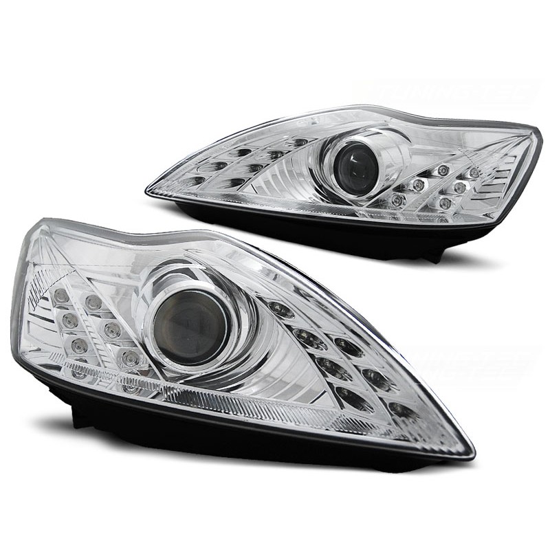 Découvrez les phares à projecteur pour votre Ford Focus, conçus pour offrir une visibilité optimale et un design moderne. Ces feux de jour chromés sont l'accessoire idéal pour améliorer l'apparence et la sécurité de votre véhicule.
