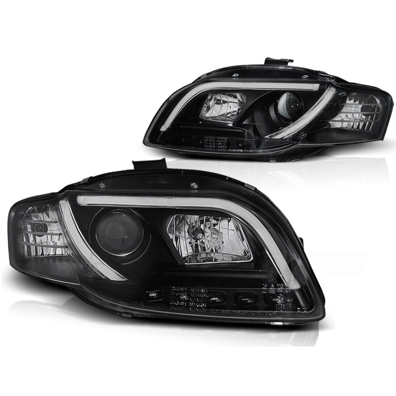 Découvrez les phares TUBE LIGHT noirs spécialement conçus pour votre AUDI A4 B7 (modèles de novembre 2004 à mars 2008). Ces projecteurs avant, dotés de la technologie LED de pointe, vous offrent une visibilité optimale et un design moderne qui rehaussera l'esthétique de votre véhicule.