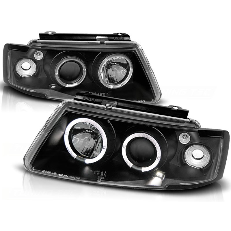 Découvrez les phares ANGEL EYES noirs spécialement conçus pour la VW PASSAT B5 3B, modèles de novembre 1996 à août 2000. Ces projecteurs avant, dotés de doubles cercles halo, apportent une touche d'élégance et de modernité à votre véhicule tout en garantissant une visibilité optimale. 100% neufs et vendus par paire, ces phares sont homologués avec le marquage E, assurant un usage légal sur route.
