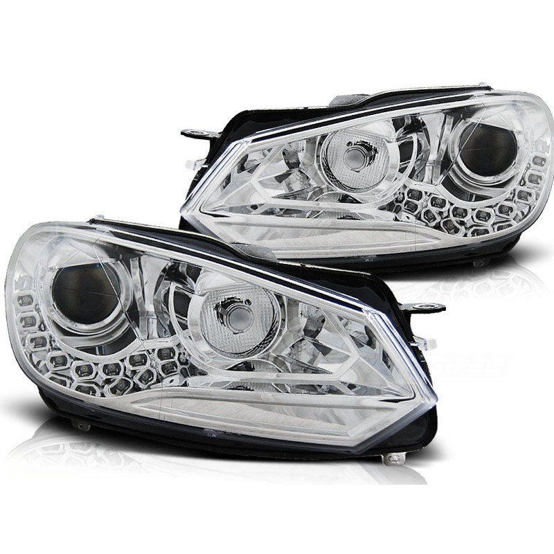 Découvrez les phares avant TRUE DRL chrome spécialement conçus pour la VW Golf 6 (modèles de 2010 à 2012). Ces phares à projecteur, dotés de Daytime Running Lights (DRL), allient technologie avancée et design moderne pour transformer l'apparence de votre véhicule tout en améliorant votre sécurité sur la route.