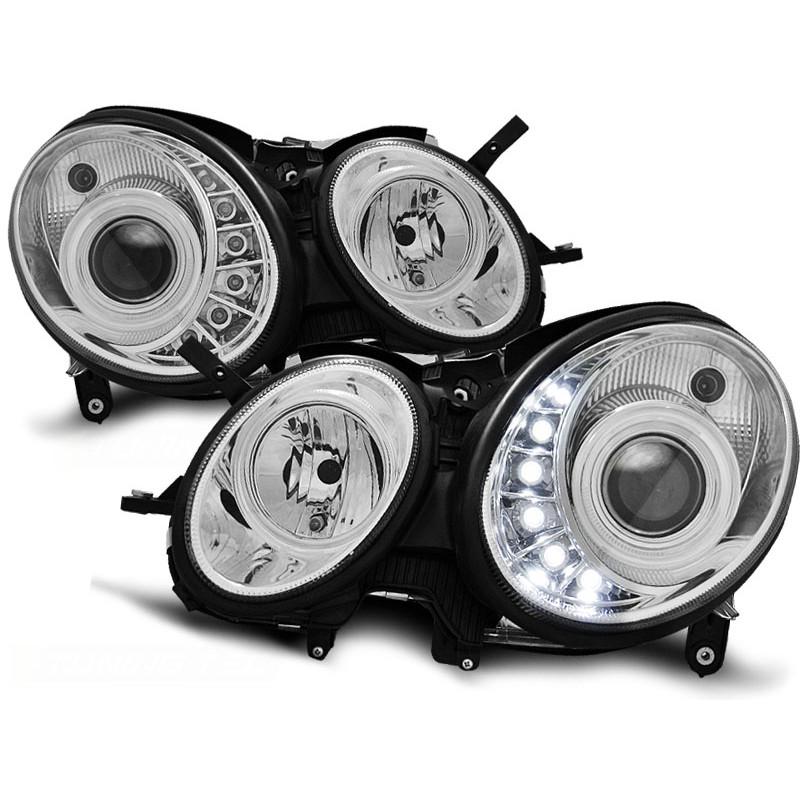 Découvrez les phares de jour chromés spécialement conçus pour la MERCEDES W211 E-KLASA, modèles de 2003 à 2006. Ces phares à projecteur, dotés de lumières de stationnement LED, apportent une touche de modernité et de sophistication à votre véhicule tout en garantissant une visibilité optimale sur la route.