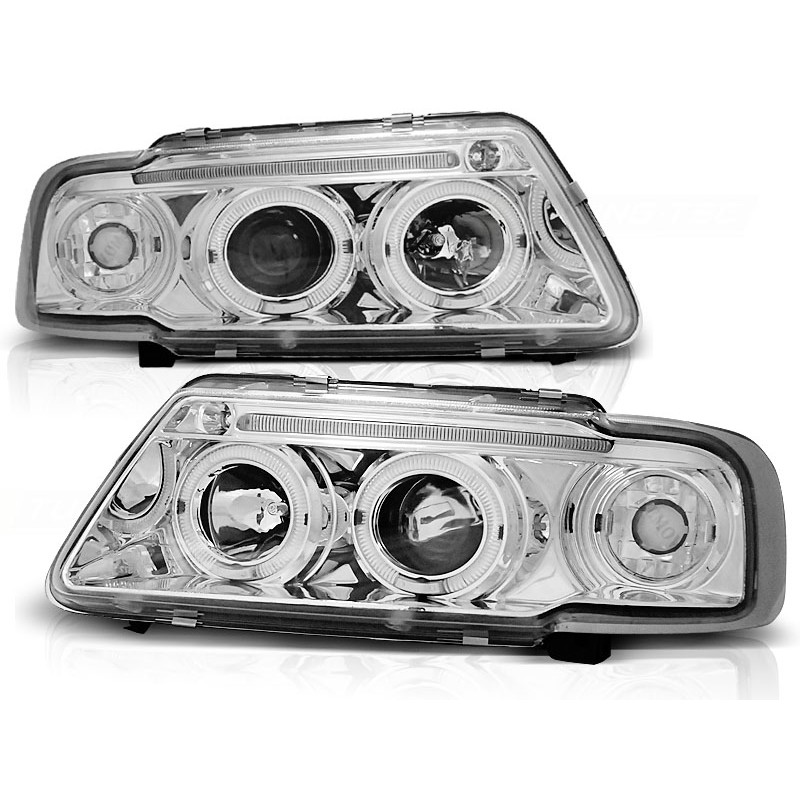 Découvrez les Phares Angel Eyes Chrome spécialement conçus pour votre AUDI A3 8L, modèles de 1996 à 2000. Ces phares à projecteur, dotés de doubles cercles halo, apportent non seulement une touche esthétique moderne à votre véhicule, mais garantissent également une visibilité optimale sur la route.