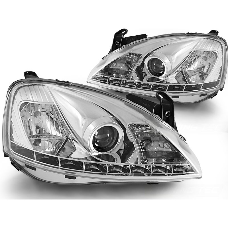 Découvrez les feux de jour chromés pour OPEL CORSA C, conçus pour transformer l'apparence de votre véhicule tout en améliorant votre visibilité sur la route. Ces projecteurs avant, équipés de lumières de stationnement LED, sont non seulement esthétiques mais aussi fonctionnels, garantissant une conduite en toute sécurité.
