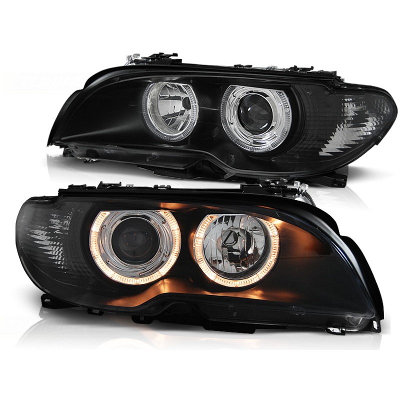 Découvrez les phares Angel Eyes noirs spécialement conçus pour les modèles BMW E46 Coupé et Cabriolet de 2004 à 2006. Ces projecteurs avant, dotés de doubles cercles halo, apportent une touche de modernité et d'élégance à votre véhicule tout en garantissant une visibilité optimale sur la route.
