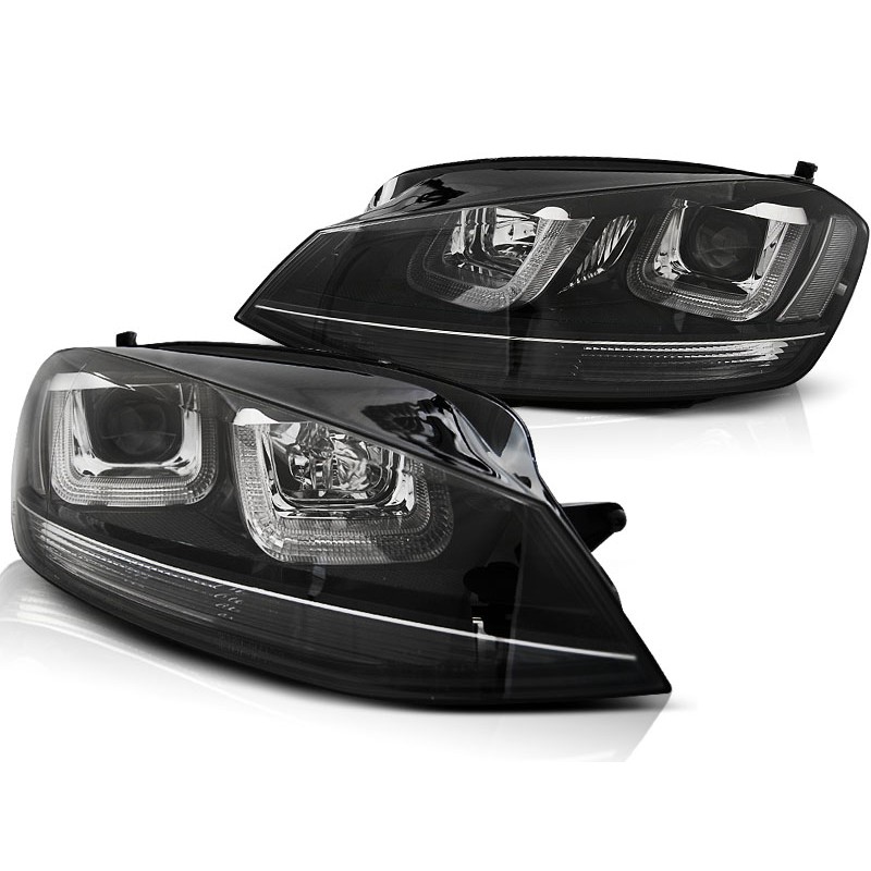 Découvrez les phares U-LED noir avec ligne noire spécialement conçus pour la VW Golf 7, modèles de 2011 à 2017. Ces phares à projecteur, équipés de Daytime Running Lights (DRL) en forme de U, apportent une touche de modernité et de sophistication à votre véhicule tout en garantissant une visibilité optimale.