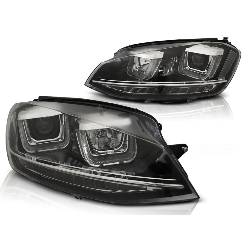 Découvrez les Phares U-LED DRL Noir spécialement conçus pour la VW Golf 7 (modèles de 2011 à 2017), une solution d'éclairage automobile qui allie technologie avancée et design moderne. Ces phares à projecteur sont équipés de Daytime Running Lights (DRL) en forme de U, offrant une visibilité accrue et un style distinctif à votre véhicule.
