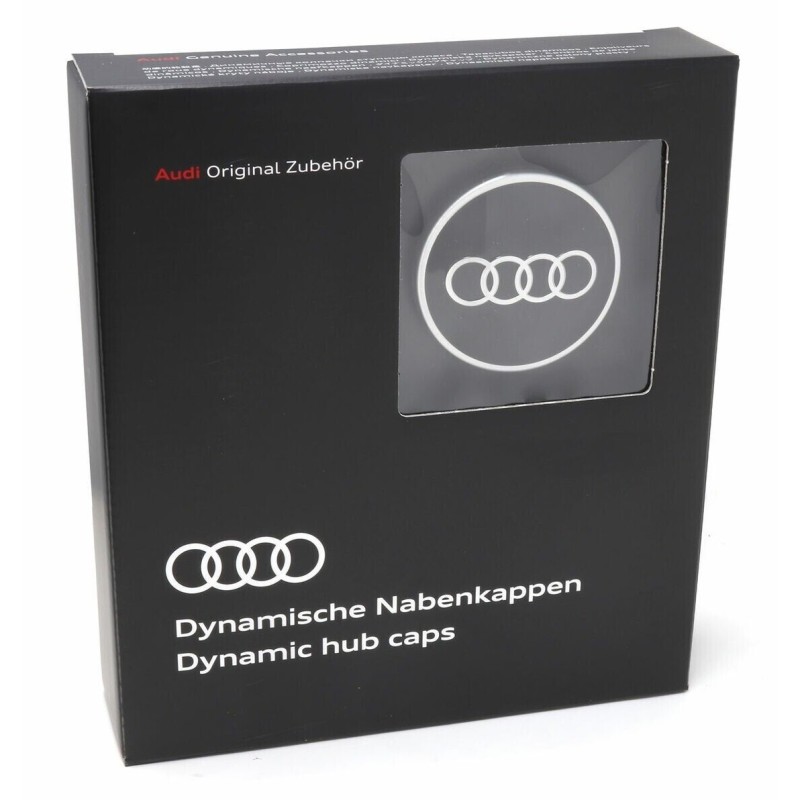 Capuchons de moyeu dynamiques Audi pour jantes en alliage avec logo debout en mode conduite Accessoire d'origine Audi 100 % Diamètre intérieur : 53 mm | Diamètre extérieur : 64 mm | Hauteur : 23,5 mm | Couleur : noir brillant, chromé Contenu de la livraison : 1 jeu = 4 capuchons de moyeu dynamiques avec instructions de montage (français non garanti).