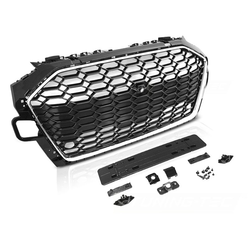 Grille avant SPORT CHROMÉ NOIR Compatibilités : AUDI A4 B9 2020- BERLINE / AVANT Convient à la version standard. Ne convient pas au pare-chocs S-Line ni au modèle RS. Convient également aux modèles équipés d’une caméra avant. Avec possibilité de connecter un capteur de stationnement. Contenu : Support de logo, Support et cache pour caméra avant, Supports pour capteurs de stationnement PDC, Cadre de plaque d’immatriculation.